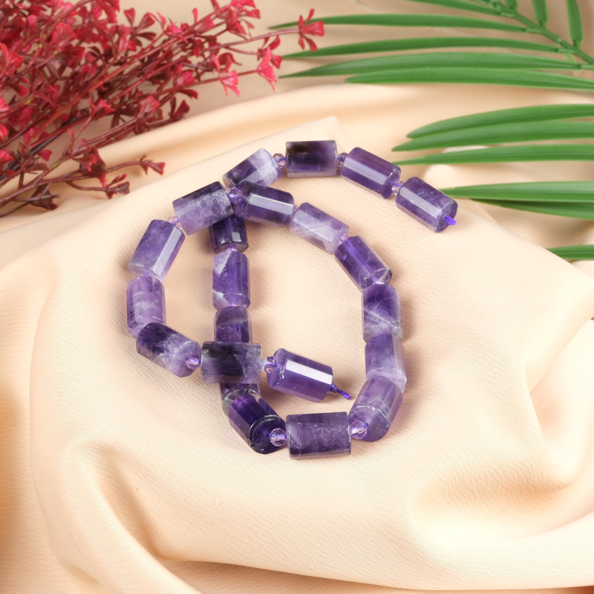 Ametist, kuvars ailesine ait mor renkli bir kristaldir ve rengini içerdiği demir mineralleri ile doğal radyasyondan alır. Brezilya, Uruguay, Rusya ve Hindistan gibi bölgelerde çıkarılır. Silindir formunda işlenmesi, taşın doğal parlaklığını ve renk geçişlerini ön plana çıkarır. Bu formu sayesinde takı tasarımlarında asil bir görünüm sağlar.