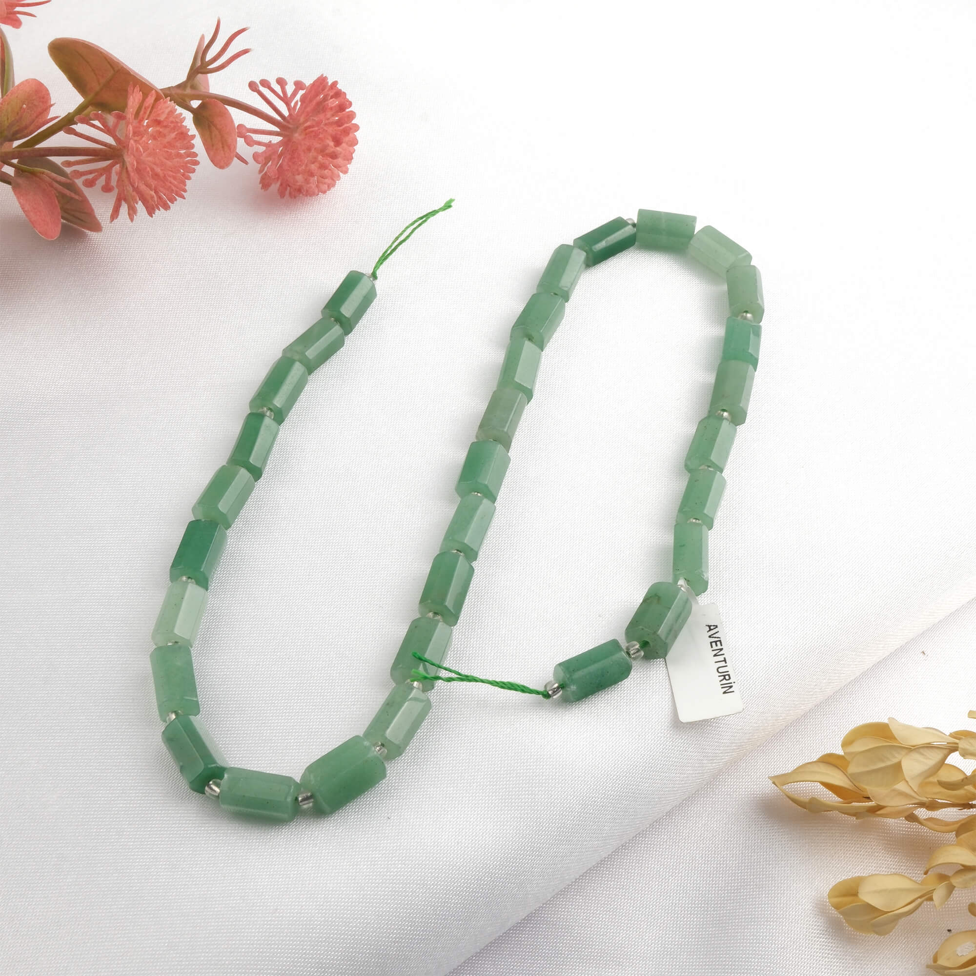 Aventurin, yeşil tonları ve doğal ışıltılı yapısıyla dikkat çeken özel bir doğal taştır. Kuvars grubuna ait olan bu taş, ışık altında hafif parlak bir görünüm sunarak estetik bir yapı oluşturur. Dizi formu, profesyonel dizim çalışmaları için düzenli kullanım avantajı sağlar.