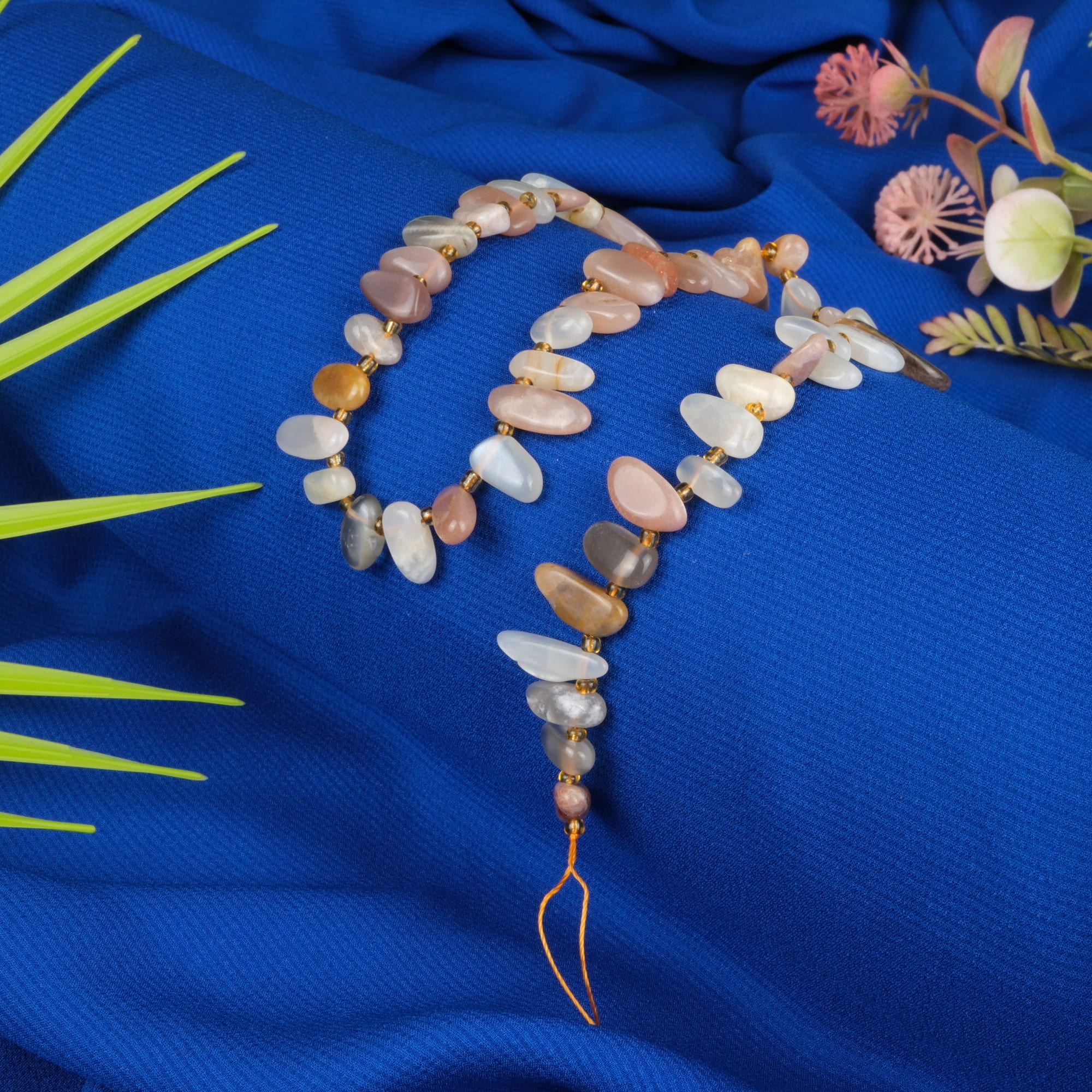 Ay Taşı, feldspat grubuna ait bir mineraldir ve adularesans adı verilen özel bir ışık yansıması özelliğine sahiptir. Hindistan ve Sri Lanka’da yoğun olarak çıkarılır. Arası boncuklu çubuk formu, taşın doğal yansımalarını daha belirgin hale getirerek takı tasarımlarında zarif bir parıltı yaratır.