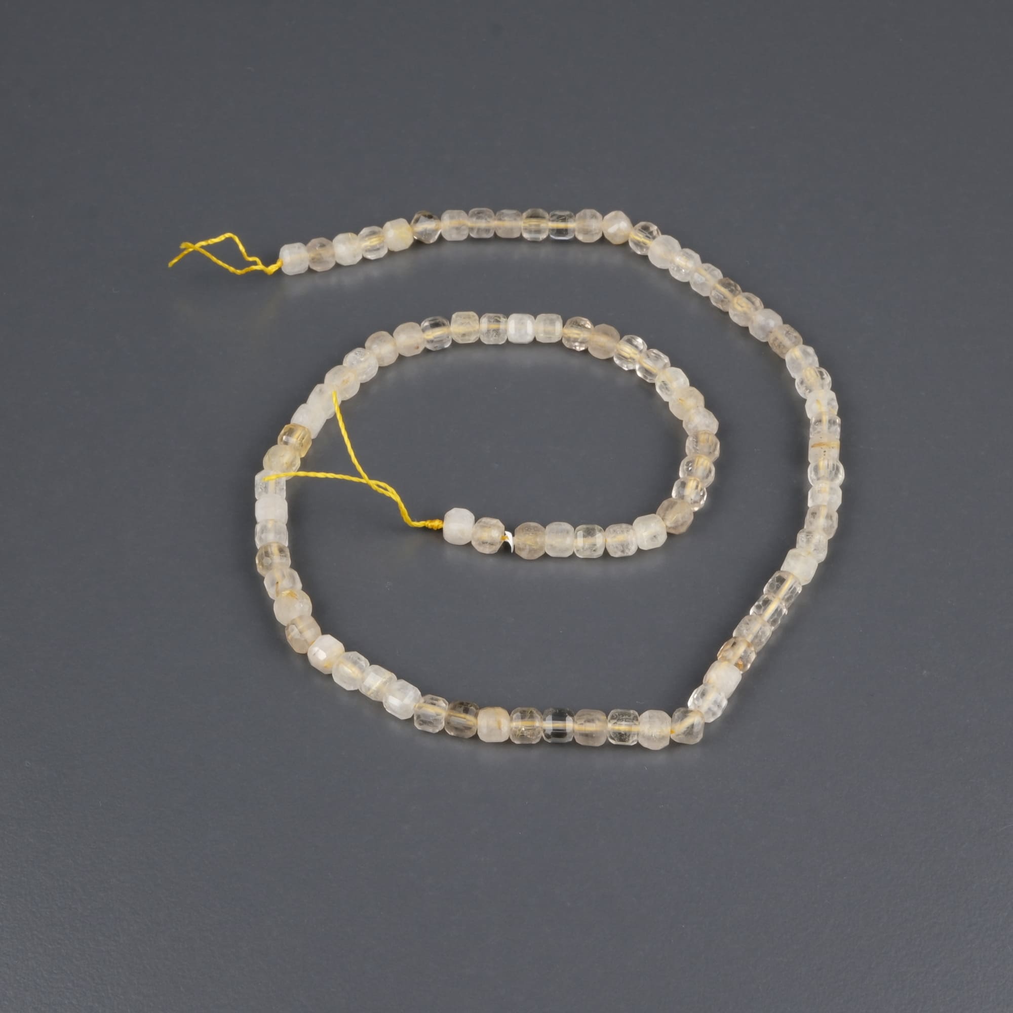 Rutil Kuvars, şeffaf kuvars kristalinin içinde altın, gümüş veya bakır tonlarında iğnemsi rutil kristallerin bulunduğu özel ve etkileyici bir doğal taştır. Bu ürün, 4mm küp kesim formunda hazırlanarak modern takı tasarımlarına zarif bir dokunuş sağlar. Hem görsel hem de enerjisel açıdan koleksiyonların en değerli parçalarından biridir.