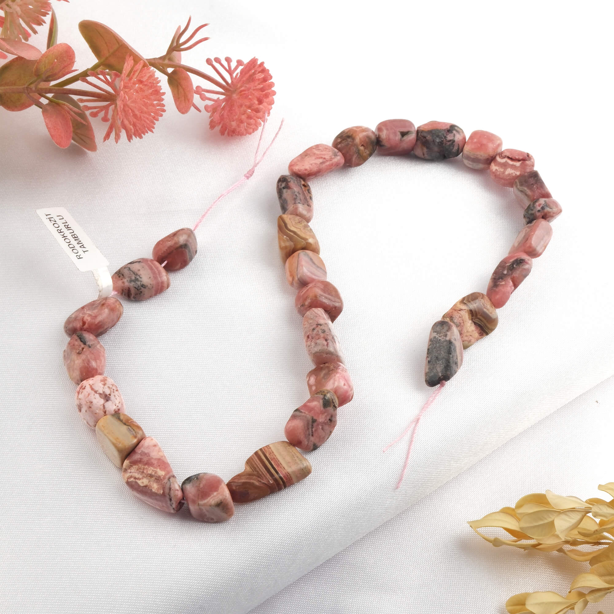 Rodokrozit, pembe ve beyaz bantlı yapısıyla dikkat çeken, manganez minerali bakımından zengin özel bir doğal taştır. Tamburlu kesim formu sayesinde taş yüzeyi pürüzsüz ve doğal bir görünüm kazanır. Dizi formu, profesyonel dizim çalışmaları için düzenli ve estetik kullanım avantajı sağlar.